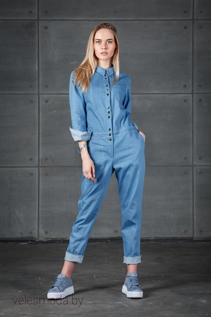 Комбинезон из джинса свободного кроя с застежкой п центру переда на 12 сквозных кнопок. Изделие отрезное по линии талии, по переду нагрудные вытачки, один накладной карман и карман в боковом шве по переднему полотнищу. По спинке накладные карманы, кокетка и талевые вытачки. Воротник стояче-отложной. Рукав одношовный втачной с манжетом на две сквозные кнопки. Отделкой служит не обработанный низ брюк и соединение манжета с рукавом.