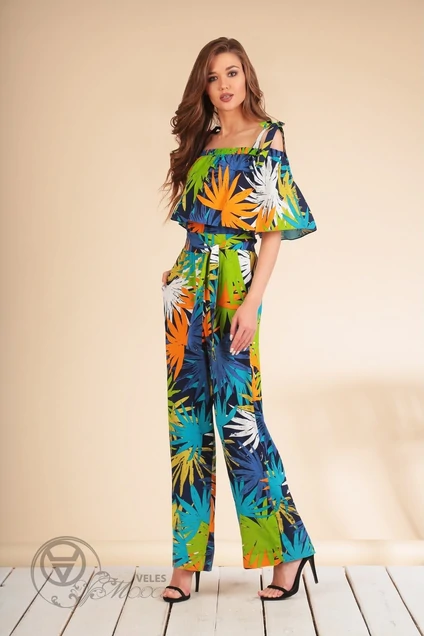 Описание внешнего вида: комбинезон на бретелях с воланом по верхнему срезу. Верх комбинезона с планкой на резинке. На передних половинках нижней части комбинезона расположены карманы, наклонные к боковому шву. Комбинезон со съемным поясом. Силуэт: полуприлегающий Цветовая гамма для верха, подкладки, фурнитуры, отделки: комбинезон выполнен из ткани с цветочным рисунком. Тип ткани: текстильный, костюмно - платьевый Комплектация: комбинезон Длина изделия: 108 см (длина брюк по боковому шву) Длина лифа спинки: 33 см Ширина изделия на уровне линии бёдер: 104-116 см (соотв. размеру)