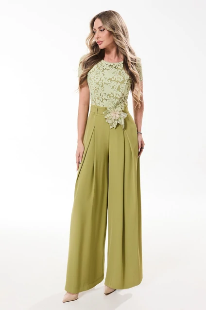 Комбинезон с круглым вырезом горловины, застежкой на потайную молнию в среднем шве спинки. Верх комбинезона по переду- двухслойный, с рельефами, выходящими из проймы. Верхняя часть спинки комбинезона со средним швом, рельефами, выходящими из проймы. Комбинезон с втачным поясом, шлевками, в которые продет съемный пояс с декоративной брошью.На передних половинках нижней части комбинезона расположены встречные складки. Задние половинки нижней части комбинезона с талиевыми вытачками.