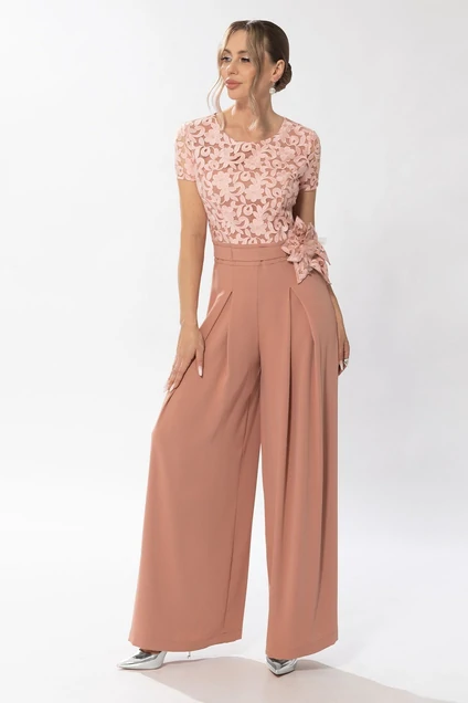 Комбинезон с круглым вырезом горловины, застежкой на потайную молнию в среднем шве спинки. Верх комбинезона по переду- двухслойный, с рельефами, выходящими из проймы. Верхняя часть спинки комбинезона со средним швом, рельефами, выходящими из проймы. Комбинезон с втачным поясом, шлевками, в которые продет съемный пояс с декоративной брошью.На передних половинках нижней части комбинезона расположены встречные складки. Задние половинки нижней части комбинезона с талиевыми вытачками.