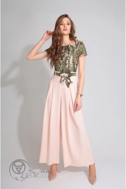 Описание внешнего вида: комбинезон с круглым вырезом горловины, застежкой на потайную молнию в среднем шве спинки. Верх комбинезона по переду- двухслойный, с рельефами, выходящими из проймы. Верхняя часть спинки комбинезона со средним швом, рельефами, выходящими из проймы. Комбинезон с втачным поясом, шлевками, в которые продет съемный пояс с декоративной брошью.На передних половинках нижней части комбинезона расположены встречные складки. Задние половинки нижней части комбинезона с талиевыми вытачками. Силуэт: полуприлегающий Вид покроя рукава: втачной, короткий Цветовая гамма для верха, подкладки, фурнитуры, отделки: комбинезон выполнен из ткани в одной цветовой гамме. Верхний слой переда, рукава из сетки с вышивкой, контрастной основной ткани. Тип ткани: текстильный, костюмно - платьевый полиэстер 82%, вискоза 15%, спандекс 3% Комплектация: комбинезон