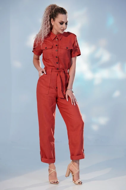 Комбинезон с центральной застежкой на петли и пуговицы, втачным воротником с отрезной стойкой. По переду- накладные карманы с клапанами расположенные на уровне груди. Накладные карманы с цельнокроенной патой расположены на уровне бедер. Спинка со средним швом. Пата рукава переходящая в погон по плечевым швам. Комбинезон со съемным поясом. Ширина изделия на уровне линии бёдер: 98,102, 106, 110, 114см (соотв. размеру)