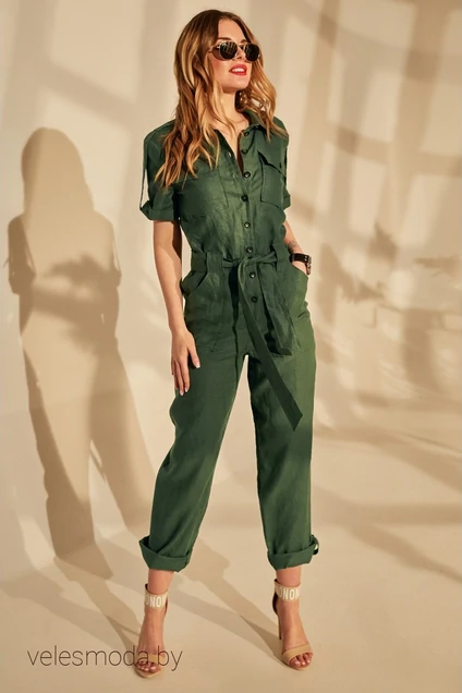 Комбинезон с центральной застежкой на петли и пуговицы, втачным воротником с отрезной стойкой. По переду- накладные карманы с клапанами расположенные на уровне груди. Накладные карманы с цельнокроенной патой расположены на уровне бедер. Спинка со средним швом. Пата рукава переходящая в погон по плечевым швам. Комбинезон со съемным поясом.