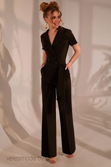Комбинезон с центральной двубортной застежкой на петли и пуговицы, втачным воротником и отрезными лацканами пиджачного типа. Лиф переда с рельефами, выходящими из проймы. Лиф спинки со средним швом, талиевыми вытачками. Нижняя часть комбинезона с застежкой- гульфик, карманами по передним половинкам . Вход в карман наклонный к боковому шву. Комбинезон со съемным поясом.