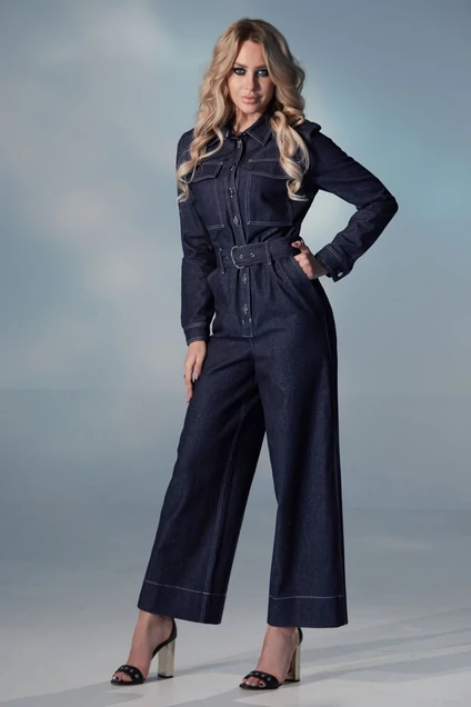 Комбинезон с центральной застежкой на петли и пуговицы, втачным воротникос с отрезной стойкой. По переду- нагрудные вытачки, накладные карманы с клапаном. Нижняя часть переда с карманами. Вход в карман наклонный к боковому шву. Спинка с отрезной кокеткой. Рукав с отрезной манжетой. Комбинезон со съемным поясом.