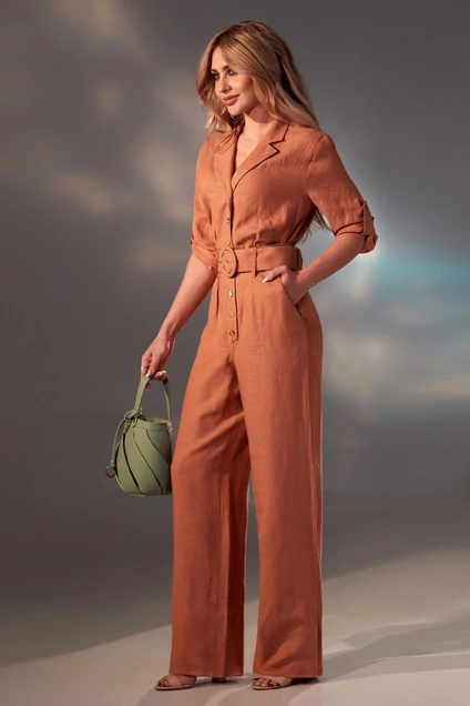 комбинезон с центральной застежкой на петли и пуговицы, отложным воротником и лацканами. По переду- нагрудные вытачки. Нижняя часть переда с карманами. Вход в карман наклонный к боковому шву. Спинка со средним швом. Пата рукава фиксируется пуговицей. Комбинезон со съемным поясом.