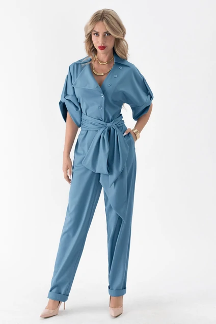 комбинезон с центральной двубортной застежкой на пришивные кнопки, отложным воротником и лацканами. Рукав реглан, длинный, с отрезной манжетой. Нижняя часть комбинезона с карманами, вход в карман наклонный к боковому шву. По талии шов присборен резинкой. Комбинезон со съемным поясом.