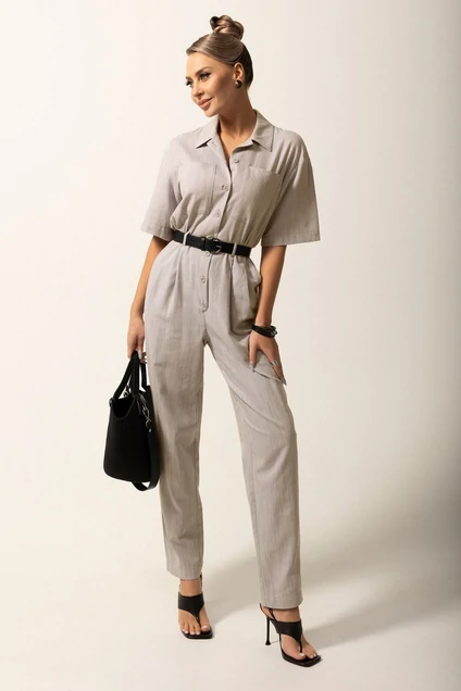Комбинезон с центральной застежкой на петли и пуговицы, втачным воротником с отрезной стойкой. По переду- накладные карманы, расположенные на уровне груди. Спинка со средним швом. Комбинезон со съемным поясом. Нижняя часть комбинезона с карманами, и двумя односторонними складками, вход в карман наклонный к боковому шву.