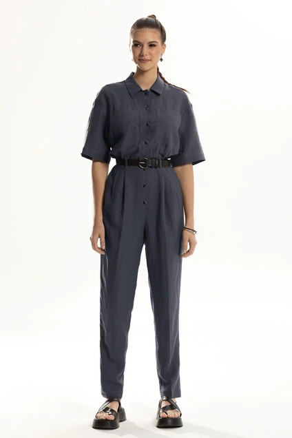 Комбинезон с центральной застежкой на петли и пуговицы, втачным воротником с отрезной стойкой. По переду- накладные карманы, расположенные на уровне груди. Спинка со средним швом. Комбинезон со съемным поясом. Нижняя часть комбинезона с карманами, и двумя односторонними складками, вход в карман наклонный к боковому шву.