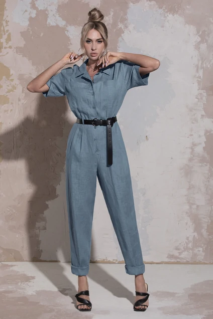 Комбинезон с центральной застежкой на петли и пуговицы, втачным воротником с отрезной стойкой. По переду- накладные карманы, расположенные на уровне груди. Спинка со средним швом. Комбинезон со съемным поясом. Нижняя часть комбинезона с карманами, и двумя односторонними складками, вход в карман наклонный к боковому шву.