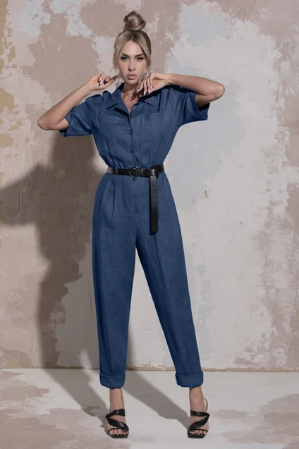 Комбинезон с центральной застежкой на петли и пуговицы, втачным воротником с отрезной стойкой. По переду- накладные карманы, расположенные на уровне груди. Спинка со средним швом. Комбинезон со съемным поясом. Нижняя часть комбинезона с карманами, и двумя односторонними складками, вход в карман наклонный к боковому шву.