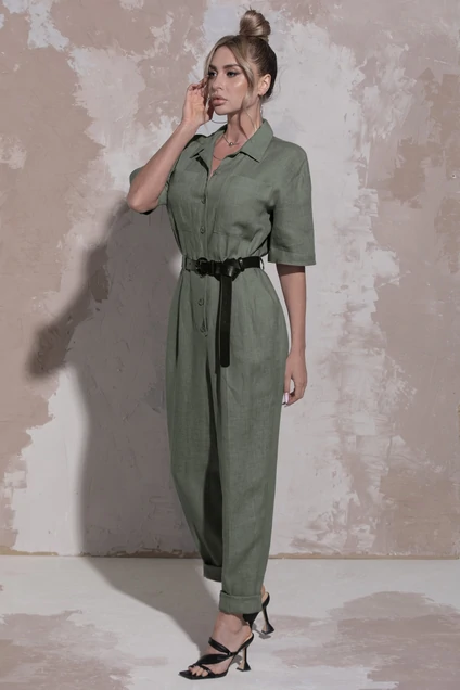 Комбинезон с центральной застежкой на петли и пуговицы, втачным воротником с отрезной стойкой. По переду- накладные карманы, расположенные на уровне груди. Спинка со средним швом. Комбинезон со съемным поясом. Нижняя часть комбинезона с карманами, и двумя односторонними складками, вход в карман наклонный к боковому шву.