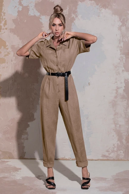 Комбинезон с центральной застежкой на петли и пуговицы, втачным воротником с отрезной стойкой. По переду- накладные карманы, расположенные на уровне груди. Спинка со средним швом. Комбинезон со съемным поясом. Нижняя часть комбинезона с карманами, и двумя односторонними складками, вход в карман наклонный к боковому шву.