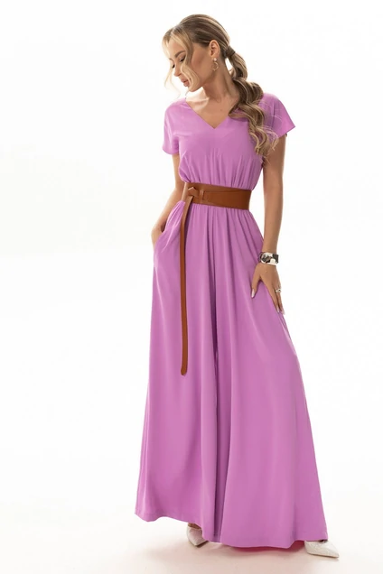 Комбинезон с центральной застежкой на потайную молнию в среднем шве спинки, без воротника, с V-образным вырезом горловины. В боковых швах расположены карманы. Комбинезон без рукавов, со спущенным плечом, разрезом по плечевому шву. Комбинезон отрезной по линии талии, шов по талии присборен на резинку. Комбинезон со съемным поясом.