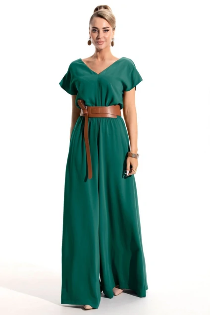 Комбинезон с центральной застежкой на потайную молнию в среднем шве спинки, без воротника, с V-образным вырезом горловины. В боковых швах расположены карманы. Комбинезон без рукавов, со спущенным плечом, разрезом по плечевому шву. Комбинезон отрезной по линии талии, шов по талии присборен на резинку. Комбинезон со съемным поясом.