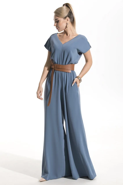 Комбинезон с центральной застежкой на потайную молнию в среднем шве спинки, без воротника, с V-образным вырезом горловины. В боковых швах расположены карманы. Комбинезон без рукавов, со спущенным плечом, разрезом по плечевому шву. Комбинезон отрезной по линии талии, шов по талии присборен на резинку. Комбинезон со съемным поясом.