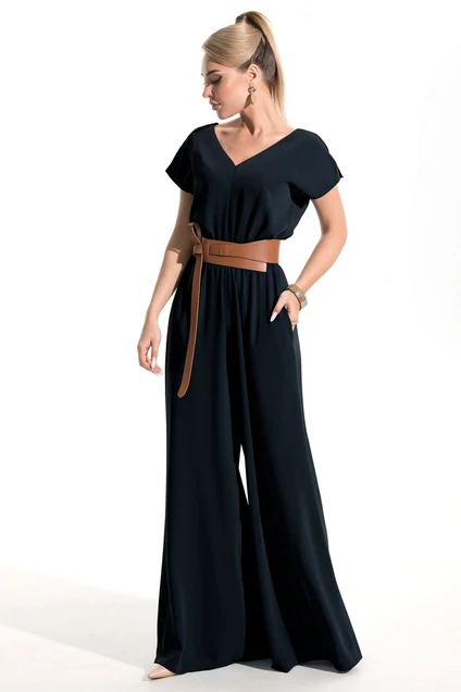 Комбинезон с центральной застежкой на потайную молнию в среднем шве спинки, без воротника, с V-образным вырезом горловины. В боковых швах расположены карманы. Комбинезон без рукавов, со спущенным плечом, разрезом по плечевому шву. Комбинезон отрезной по линии талии, шов по талии присборен на резинку. Комбинезон со съемным поясом.