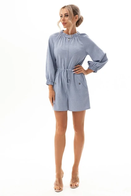 Комбинезон с центральной застежкой на молнию, воротником- стойкой. Воротник присборен на резинку, с патой на одну петлю и пуговицу. Комбинезон по талии присборен кулисой со шнуром. На нижней части комбинезона расположены прорезные карманы с двумя обтачками. Рукав реглан, 3/4, с отрезной манжетой, присборенной на резинку.