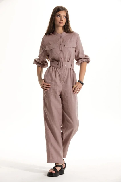 Комбинезон с отрезной планкой по переду, центральной застежкой на петли и пуговицы, воротником- стойкой. По верхней части переда накладные карманы с клапанами. Комбинезон по талии присборен на резинку. В боковых швах нижней части комбинезона выполнены карманы. Плечо спущенное. Рукав втачной, 3/4, с отрезной манжетой, присборенной на резинку. Комбинезон со съемным поясом.