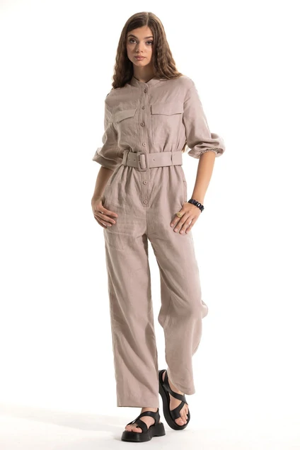 Комбинезон с отрезной планкой по переду, центральной застежкой на петли и пуговицы, воротником- стойкой. По верхней части переда накладные карманы с клапанами. Комбинезон по талии присборен на резинку. В боковых швах нижней части комбинезона выполнены карманы. Плечо спущенное. Рукав втачной, 3/4, с отрезной манжетой, присборенной на резинку. Комбинезон со съемным поясом.