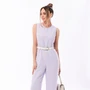 Комбинезон с центральной застежкой на петли и пуговицы, без воротника, с V-образным вырезом горловины. По переду с нагрудными вытачками. Спинка со средним швом. В боковых швах нижней части комбинезона выполнены карманы. На уровне линии талии расположена кулиса со шнуром. Рукав втачной, ¾, с патой, закрепленной к рукаву петлей и пуговицей.