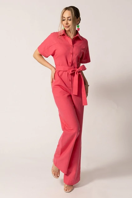 Комбинезон с отрезной планкой по переду, центральной застежкой на петли и пуговицы, втачным воротником с отрезной стойкой. По переду и спинке с отрезной кокеткой. В боковых швах нижней части комбинезона выполнены карманы. Плечо спущенное. Рукав цельнокроенный . Комбинезон со съемным поясом.