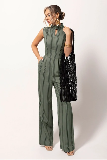 Комбинезон с застежкой на потайную молнию в среднем шве спинки, с отрезной стойкой, застегивающейся на две петли и пуговицы со стороны спинки. Лиф переда со средним швом и рельефами, выходящими из проймы Лиф спинки со средним швом, талиевыми вытачками. На передних половинках нижней части комбинезона выполнены карманы. Вход в карман наклонный к боковому шву. Комбинезон без рукавов.