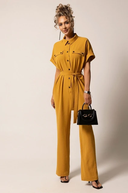 Комбинезон с центральной застежкой на петли и пуговицы, втачным воротником с отрезной стойкой. Перед и спинка с отрезной кокеткой. По переду из кокеток выходят клапаны. На передних половинках нижней части комбинезона выполнены карманы. Плечо спущенное. Низ рукава с отложной манжетой. Комбинезон со съемным поясом.