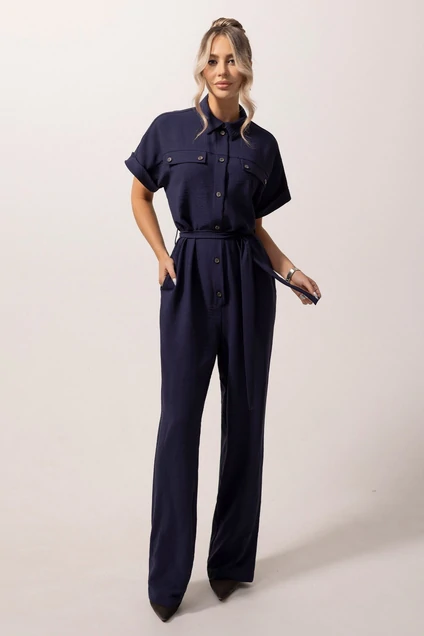 Комбинезон с центральной застежкой на петли и пуговицы, втачным воротником с отрезной стойкой. Перед и спинка с отрезной кокеткой. По переду из кокеток выходят клапаны. На передних половинках нижней части комбинезона выполнены карманы. Плечо спущенное. Низ рукава с отложной манжетой. Комбинезон со съемным поясом.