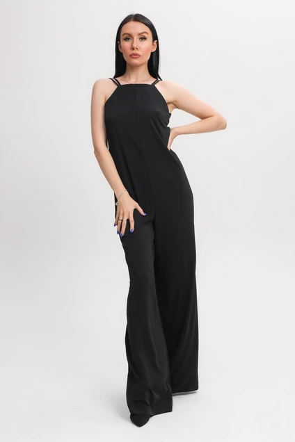 Чёрный женский летний комбинезон на бретелях с модными широкими брюками. Брючный комбинезон без рукавов, на регулируемых бретелях без застежки. Комбинезон прямого силуэта без карманов, утяжки по поясу нет. Благодаря широкому крою моделирует фигуру, будет удобен для беременных и кормящих мам.