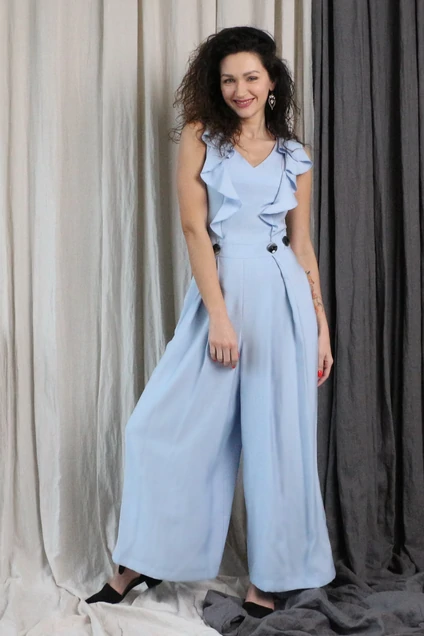 Комбинезон женский, повседневно-нарядный, прилегающего силуэта. Комбинезон отрезной по линии талии, со вставленным двойным поясом. На боковых швах на линии бедра расположены прорезные карманы. Перед с рельефами проходящими через центр груди с вставленной оборкой до линии талии. Спинка со средним швом в котором обработана застежка на потайную тесьму - молнию. Верх комбинезона обтачной.