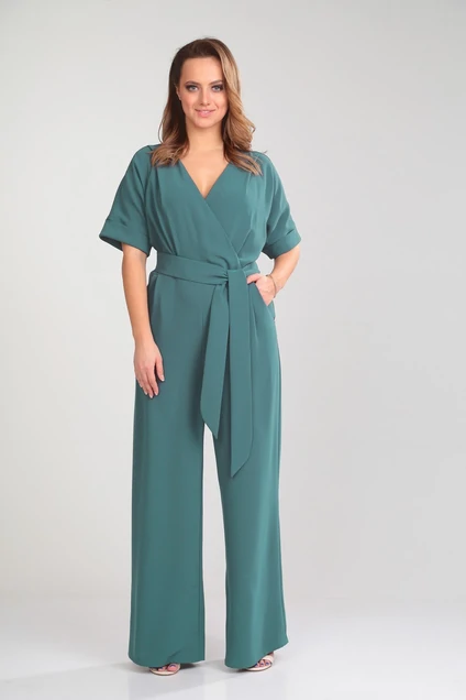Комбинезон с V-образным вырезом горловины, застежкой на потайную молнию в боковом шве . Верх комбинезона по переду- с рельефами, выходящими из проймы. Верхняя часть спинки комбинезона со средним швом, рельефами, выходящими из проймы. Комбинезон со притачным поясом. На передних половинках нижней части комбинезона расположены встречные складки и карманы. Вход в карман наклонный к боковому шву. Задние половинки нижней части комбинезона с талиевыми вытачками.Комбинезон полуприлегающего силуэта.