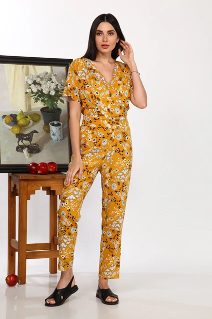 Комбинезон с V-образным вырезом горловины, застежкой на потайную молнию в боковом шве . Верх комбинезона по переду- с рельефами, выходящими из проймы. Верхняя часть спинки комбинезона со средним швом, рельефами, выходящими из проймы. Комбинезон со притачным поясом. На передних половинках нижней части комбинезона расположены встречные складки и карманы. Вход в карман наклонный к боковому шву. Задние половинки нижней части комбинезона с талиевыми вытачками.Комбинезон полуприлегающего силуэта.