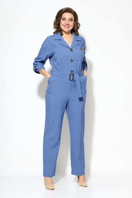 Женский комбинезон из ткани с добавлением льна. Застежка комбинированная, по лифу на декоративные пуговицы, по брюкам на молнию. Брюки с карманами в боковых швах. По горловине воротник с лацканами. На полочках накладные карманы с декоративной нашивкой. Линия плеча опущена, рукав ¾ с патой на пуговицу. По талии на лифе неглубокие складки и шлевки для сьемного пояса. Пояс с пряжкой.