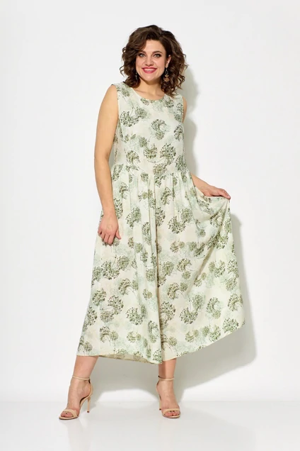 Комфортный летний комбинезон из легкой принтованной ткани, без рукавов, силуэт свободный, линия талии слегка опущена, с небольшой сборкой. Брюки расширены к низу, длина 7/8. Вырез горловины круглый, с застежкой по спинке на навесную петлю с пуговицей. В среднем шве по спинке потайная молния. В боковых швах карманы.