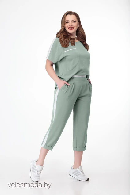 Комбинезон молодежный Блузон комбинезона прямого силуэта с цельнокроеным рукавом. По переду наладной карман с белой отделкой. Брюки укороченные (капри) свободного покроя зауженные книзу. В брюках карманы с отрезым бочком.Пояс брюк притачной, задняя часть которого на эластичной теьме.Блузон комбинезона и брюки соединяются по переду разъемной молкией. По плечевым швам блузона и боковым швам брюк вставки из белой отделочной ткани.