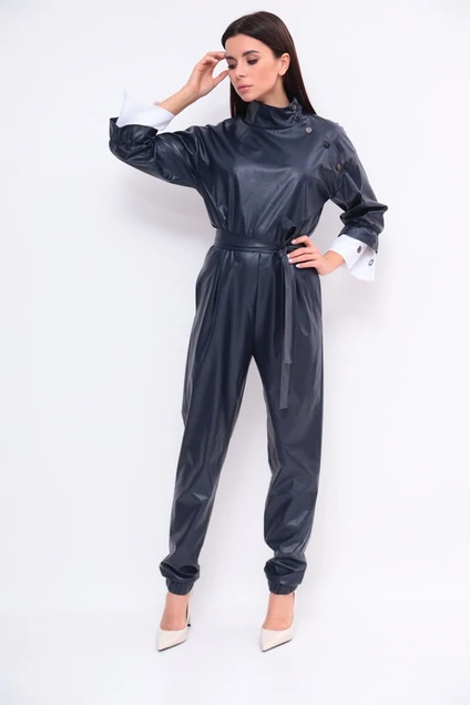 Стильный женский комбинезон выполненный из эко-кожи.Комбинезон отрезной по линии талии на резинке,плечо спущенное с притачным рукавом,край которого декорирован манжетами с люверсами.Вортник-стойка.Застежка по переду на кнопки выполнена из стойки в пройму левой стороны.В боковых швах карманы.Застежка на навесные петли и пуговицы по стойке спинки.Пояс съемный выполнен из эко-кожи.