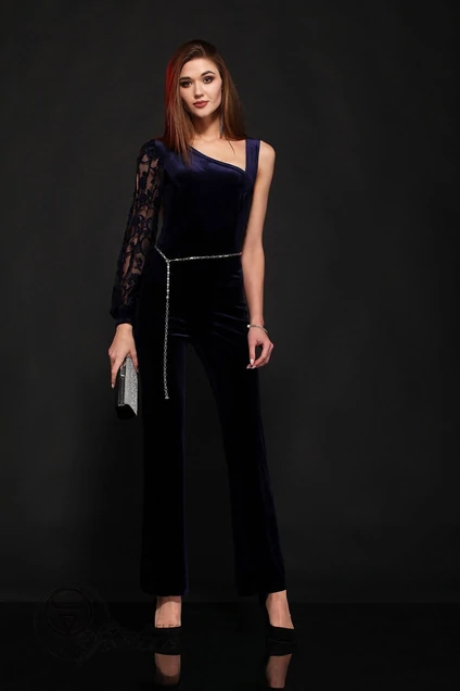 Прекрасный бархатный комбинезон для вечернего выхода. Облегающий силуэт и ассиметричный покрой с одним открытым плечом. Струящийся рукав из сетки с декоративным бархатным принтом в виде объемного кружева на манжете. Длина рукава от плеча 67 см. Длина изделия по спинке от плеча 150 см.