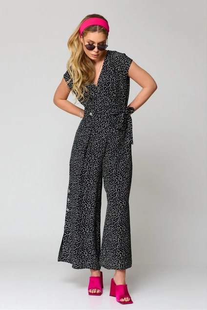 Комбинезон женский, свободного силуэта, со спущенной линией плеча, с втачным поясом на уровне линии талии, с застежкой на потайную тесьму-молнию в левом боковом шве, с поясом, который по переду крепится на 2 пуговицы, по спинке протянут через 2 шлевки. Лиф детали переда комбинезона с запахом, на уровне талии обработаны 2 складки на лицо. На нижней части по шву притачивания пояса обработаны по одной складке на каждой половинке. Лиф детали спинки комбинезона со средним швом, вверху которого обработан разрез с застежкой на 1 навесную петлю и пуговицу, с талиевыми вытачками. На нижней части по шву притачивания пояса обработаны по одной вытачке на каждой половинке. В боковых швах обработаны карманы, и шлицы, на которых с каждой стороны прикреплены по 3 пуговицы. Вырез горловины комбинезона «V-образной» формы, обработан обтачкой.Длина спинки – 123см.