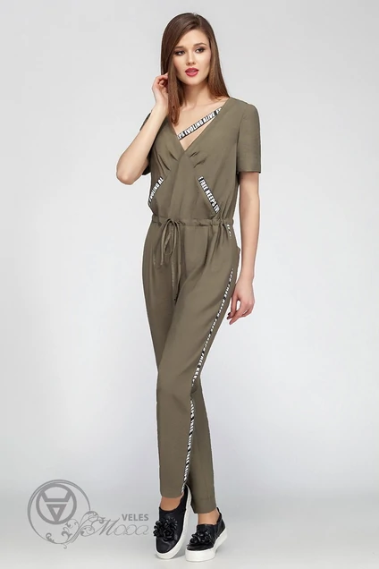 Комбинезон. Молодежный комбинезон полуприлегающего силуэта, выполнен из легкой пластичной ткани, отделка - спортивная тесьма. Впереди ниже уровня талии кулиска, сквозь которую продет шнур из той же ткани. Вырез горловины подчеркнут тесьмой, которая фиксируется изнутри на кнопку. Рукав короткий. На кокетках складки, внутренние карманы «кенгуру» подчеркнуты тесьмой. По спинке та же кулиска, глубокий вырез подчеркнут отделочной тесьмой. По линии плеча с обеих сторон застежка на пуговицы для удобства при одевании комбинезона. В нижней части комбинезона впереди у кулиски заложены складки, на заднем полотнище - кокетка, у кокетки внутренние карманы с листочками. Крой брюк мягкий, струящийся с заужением к низу. Брюки с лампасами из тесьмы. Длина сзади от плеча до пояса 43 см, от пояса до низа по боковому шву 100 см. Длина рукава 25 см.