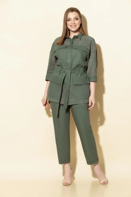 Комплект женский, прямого силуэта, состоящий из рубашки и брюк. Рубашка: застежка на петли-пуговицы по отрезной планке, рукав рубашечного типа с манжетой, по полочке и спинке отрезные кокетки. Изделие отрезное по талии, с втягивающимся поясом-резинкой. Брюки свободного кроя, зауженные книзу, на отрезном поясе с резинкой. Карманы в боковых швах с отрезным бочком. По низу манжета. Без подкладки