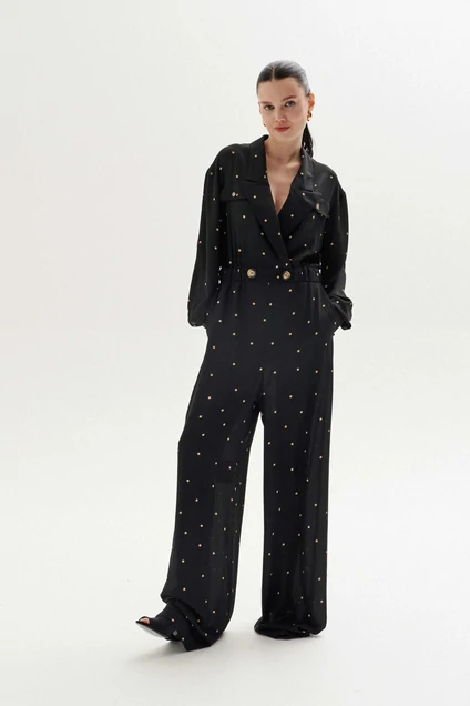 Комбинезон свободного кроя выполнен из тонкой плательной ткани дизайна горох. Линия плеча спущенная, по низу рукава манжета на застёжку. Воротник пиджачного типа с имитацией двубортной застёжки на пуговицы. По линии талии отрезной пояс, по спинке частично на резинке. По спинке средний шов, переходящий в застёжку на петлю и пуговицу. Брюки прямого силуэта свободного кроя. Карманы боковых швах.