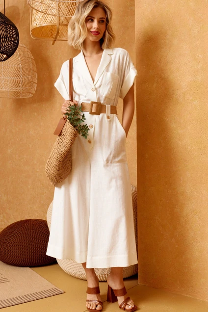 Комбинезон брючный. Рукав реглан. По переду воротник с лацканом, застёжка на пуговицы, по бокам накладные функциональные карманы. Брюки-юбка, на тонкой хлопковой подкладке по всей длине брюк. По линии талии отрезной пояс с патами, по задней части пояса вставлена резинка. Пояс идет в комплекте.