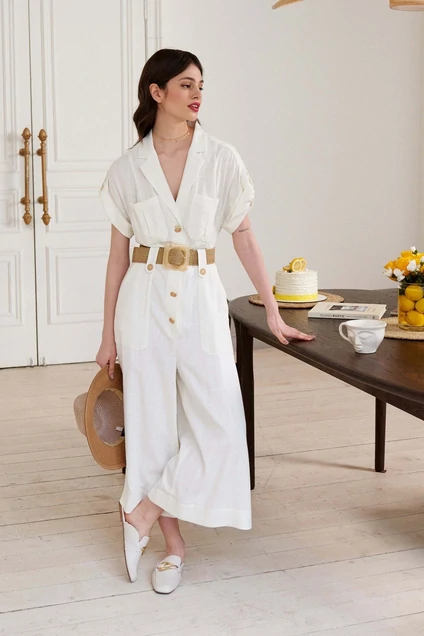 Комбинезон брючный. Рукав реглан. По переду воротник с лацканом, застёжка на пуговицы, по бокам накладные функциональные карманы. Брюки-юбка, на тонкой хлопковой подкладке по всей длине брюк. По линии талии отрезной пояс с патами, по задней части пояса вставлена резинка. Пояс идет в комплекте.