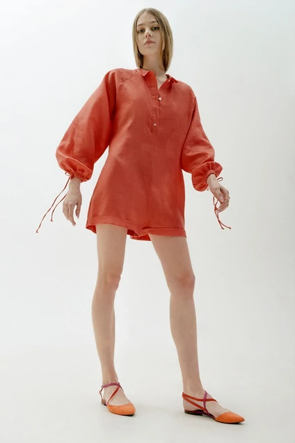 Льняной комбинезон с длинным рукавом, который создает расслабленный и в то же время не будничный образ: объемные рукава собираются на завязки, а форма - для расслабленной и практичной интерпретации.
