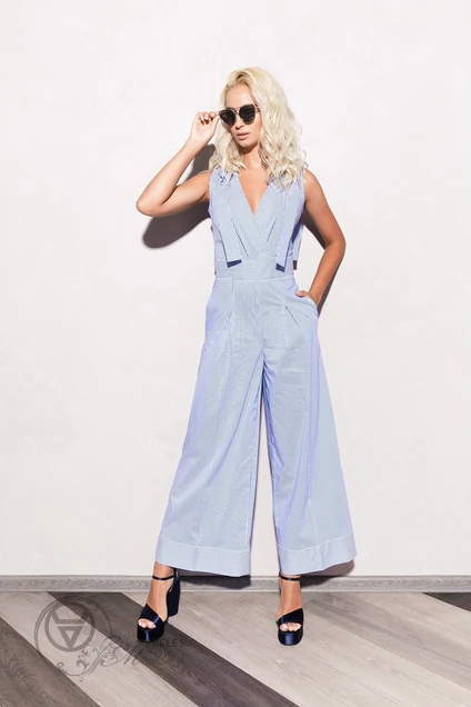 Комбинезон женский, полуприлегающего силуэта из хлопчатобумажной ткани, с имитацией на запах, который образует V-вырез горловины, отрезной по линии талии с притачным поясом скроенным в другом направлении полоски, расширенный от линии бедра за счет встречной складки по передним половинкам, с карманами в боковых швах, с застежкой на потайную молнию в среднем шве спинки, без рукава, по плечевому шву пришиты декоративные детали в виде банта, с горизонтальными подрезами по низу передней и задней половинок. Перед - с односторонней складкой по лифу. Спинка - со средним швом и талиевыми вытачками. Длина изделия – 144см