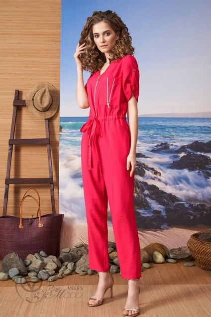 Комбинезон женский из однотонной ткани, отрезной по линии талии, с кулиской и протянутым поясом, который регулирует прилегание, с центральной застежкой на металлическую тесьму молния, с V-образным вырезом горловины переда, с накладным карманом в области груди с пришитой декоративной молнией, с коротким рукавом и патой пристегнутой на одну пуговицу, нижняя часть с карманами с наклонным входом на передней половинке. Перед - с нагрудной вытачкой. Спинка - из двух частей. Рукав - короткий. Длина изделия: 146 см Длина рукава: 27 см