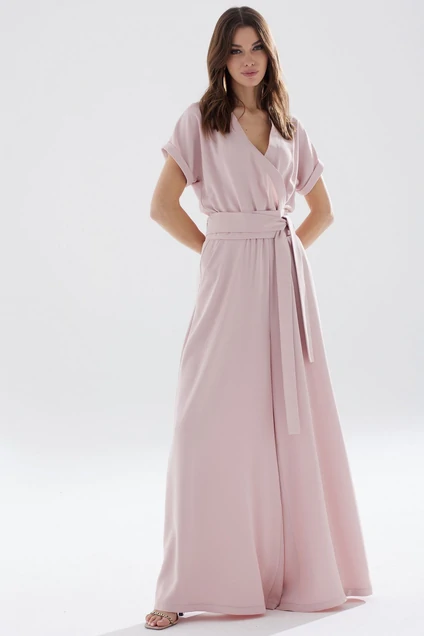 Стильный комбинезон полуприлегающего силуэта с расширенными книзу брюками из струящейся ткани. Комбинезон отрезной по линии талии на резинке, верхняя часть комбинезона на запах. По спинке в среднем шве центральная застежка на потайную молнию. В боковых швах карманы. Рукав цельнокроеный 5короткий на манжете. В комплект входит пояс из основной ткани. Длина комбинезона: 158см