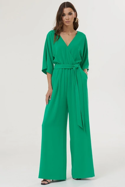 Нарядный комбинезон полуприлегающего силуэта с расширенными книзу брюками из струящейся ткани. Комбинезон отрезной по линии талии на резинке, верхняя часть комбинезона на запах. Рукав цельнокроеный длиной до локтя. По спинке V-образный вырез, в среднем шве центральная застежка на потайную молнию. В боковых швах карманы. В комплект входит пояс из основной ткани. Длина изделия: 157см