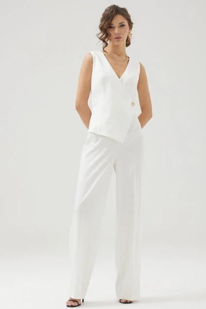Нарядный комбинезон полуприлегающего силуэта. Горловина V-образной формы. По переду ассиметричная деталь с фигурным низом и декоративной, нефункциональной пуговицей. Комбинезон отрезной по линии талии. Верх полностью на подкладке. По переду и спинке рельефы. Брюки прямого силуэта с завышенной талией. По спинке в среднем шве центральная застежка на потайную молнию. Обращаем ваше внимание, что фурнитура может незначительно отличаться от фото.Длина комбинезона от плеча до низа: в 42-48 р. - 158 см.